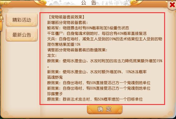 在本次战斗平衡中,除了新增鲛将军、千年僵尸与天兵的专属套装效果外,还对龙女、孤魂野鬼、珍露童子、巡游天神、猴小仙、布雨神君、噬天虎、超级神羊宠物的专属套装效果进行大幅提升,在战斗中触发几率将会更高,表现更为强势。