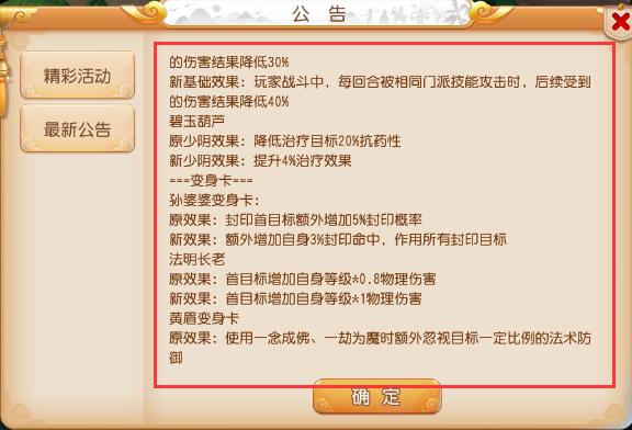 在本次战斗平衡中对于金甲仙衣、降魔斗篷、九黎战鼓、汇灵盏、安魂咒与碧玉葫芦法宝的两仪四象属性进行调整,平衡各法宝的效果,帮助玩家在战斗中能够更好的发挥其特色。同时还将对孙婆婆、黄眉与太白金星的变身卡效果进行提升,增强战斗体验。除此之外,还有龙飞阵与云垂阵的加成效果调整,平衡阵法合理性。