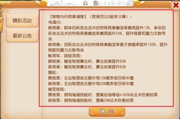 在本次战斗平衡中对鲛将军、龙女、蚌仙子、夜叉、幽莹娃娃、鬼将、幽冥书生、蟠桃童子、天兵、巨灵神将与提升2次的神兽、珍兽增加一个可镶嵌内丹位,对宠物的实力有着不小的提升。同时对电魂闪高级内丹效果进行调整,四系法术攻击的特殊效果触发率基于原概率提升100%。除此之外,还对蜃蛇、幽冥娃娃、各大神兽与灵兽的专属内丹效果进行大幅提升,增强在战斗中的表现。