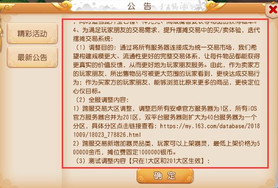在本次更新后,将对所有服务器连接成为统一交易市场,卖家出售的物品可被更大范围的玩家看到,而买家也能够浏览比原来更多的商品,以后再也不用担心摆摊商城中优秀装备与极品宠物太少的问题啦!需要注意的是跨服交易大区调整后,所有安卓官方服务器为1区,而IOS官方服务器合并为201区,双平台服务器则扩大为40台服务器为一个分区,各位小伙伴在购买商品时可要注意自己所在的分区哦。