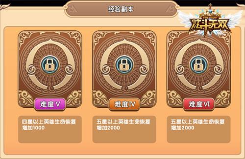在经验副本中,玩家每天可免费挑战两次,失败不计次数,通过挑战可获取提升英雄等级的必需品“经验药水”。经验药水分为超小经验瓶、小经验瓶、中号经验瓶、大经验瓶、超大经验瓶、超级经验瓶六种,不同经验瓶可给英雄提供不同的经验点,最高经验瓶可提供30000点经验。