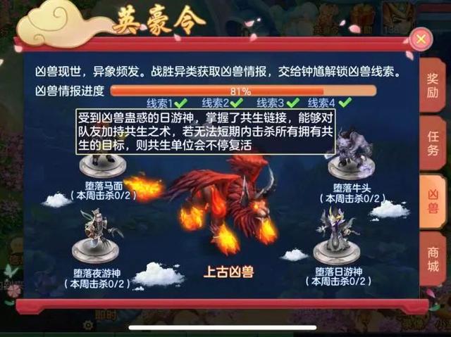 d.解锁最终凶兽线索后,可以使用四个不同的妖将讨伐令合成凶兽讨伐令,进行凶兽挑战;