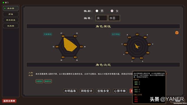 在人物出身那一栏有个问号,点击问号可以查看角色的详细属性,技艺数值,还有就是角色随机到的禁止工作,我比较喜欢没有禁止工作的人物角色,位面之子,天选之人来做掌门,想想就很带感,不知道会不会有在路边捡个包裹都是神器的这种设定出现~