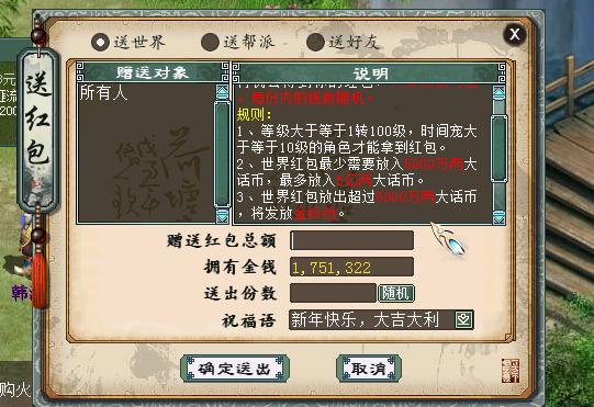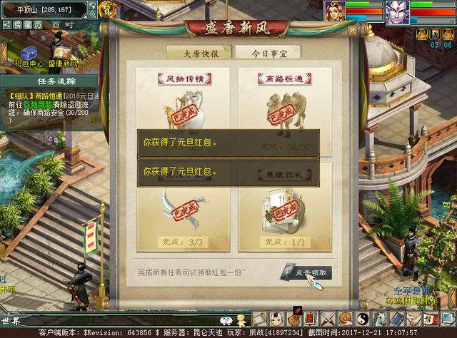 左上角还有一个盛唐新风的任务,其实就是你做完四项任务后给的一个奖励,看了下是红包,但这个红包……让我很尴尬啊,以为是给钱的,没想到是给发钱的机会