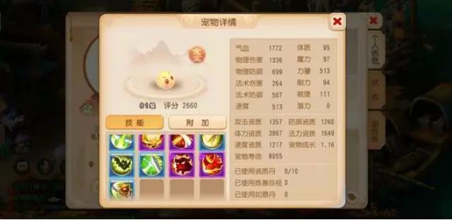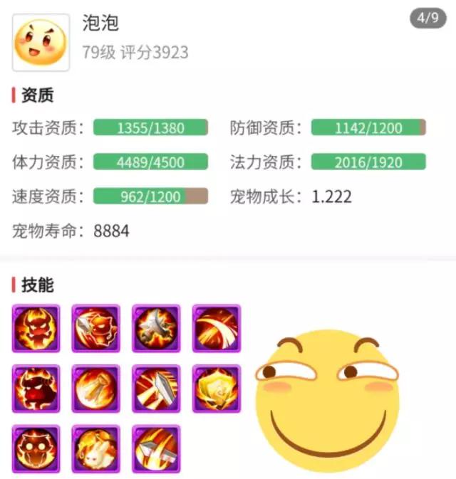 根据大佬自己介绍,他这次合宠的经历非常坎坷,为了合出个性泡泡买了不下30个账号,中间虽然出了3个8技能的泡泡,但是都不是自己想要的。有两次虽然合出了10技能的,但是都是副宠。不过好在功夫不负有心人,最终还是让自己合出了10技能的泡泡,完成了心愿,现在回头看看还是非常值的,让我们来看下大佬的这个泡泡吧。这个泡泡的成长被拉到了1.21,已经是非常不错的了,比较可惜的是资质一般般,而且10技能里面只有2个红技能,不过既然已经有了10技能宝宝,想要全红的话后面打书就是了,相信再过不久就能看到大佬的10技能泡泡成品啦。