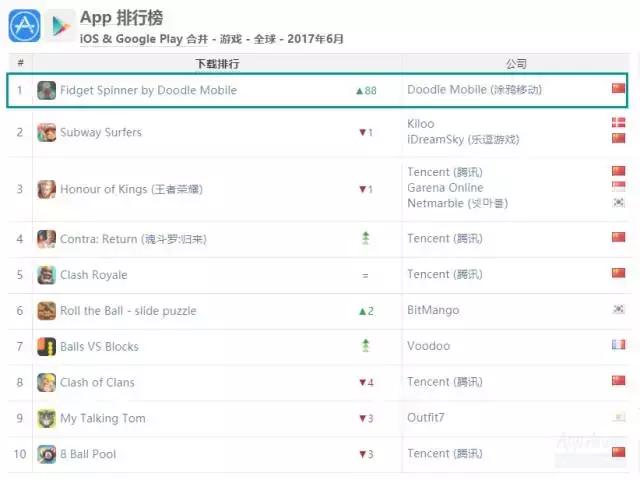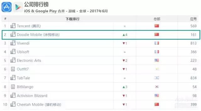 在此次AppAnnie公布的6月份数据中,包括18个手游市场。有个叫涂鸦移动的中国公司进入16个国家的iOS&Google Play下载榜TOP10(俄罗斯第4,印度第2,印度尼西亚2,墨西哥1,巴西1,意大利3)。在全球iOS&GooglePlay游戏下载总榜上,涂鸦移动仅次于腾讯,排在了第2名。