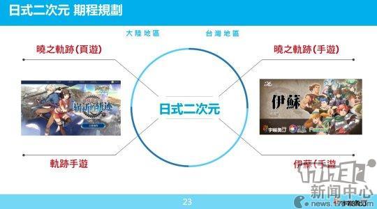 除了《三国群英传》和《幻想三国志》这两个大IP, 新作列表上还包括宇峻奥汀自研自发的竞技手游《战旗王》,以及Falcom 授权开发的《晓之轨迹》页游和手游、《伊苏》手游等等。