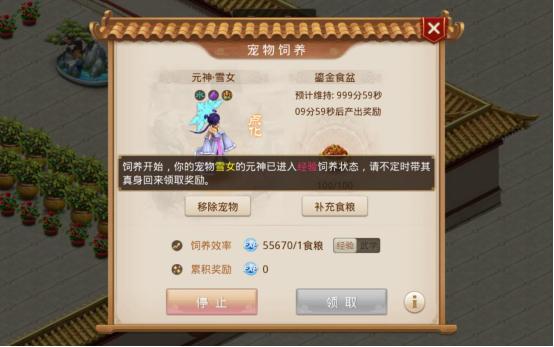 同时玩家还可进行宠物饲养,宠物等级达到50级,且在居所中安放宠物食盆类家具,即可进行饲养。饲养功能并不影响宠物外出骑乘、参战,表现为元神修炼,玩家可在体验游戏日常活动的同时,在居所中通过饲养积攒宠物的经验、武学奖励,且玩家角色下线仍可进行。从此开启爱宠多种养成模式,属性提升更轻松!