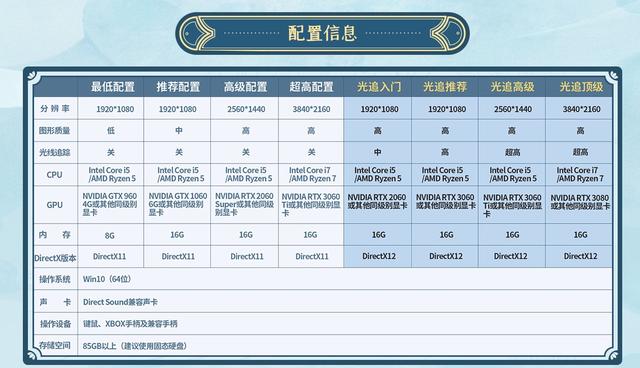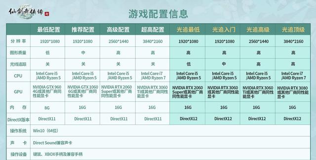 从上图中可以看出,《仙剑奇侠传7》1080p光追的最低入门配置降低了,同时光追特效也从低变成了中,配置从RTX 2060s降低到了RTX 2060。其他光追分类的特效也都提升了一个档次:中→高、高→超高。其他配置内容没有变化。