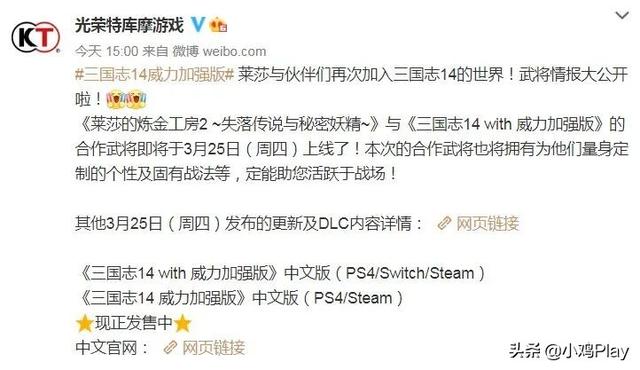 今日,光荣脱裤魔官方在微博上公布了《三国志14:威力加强版》将与《莱莎的炼金工房2:失落传说与秘密妖精》联动的消息。《莱莎的炼金工房2》的相关武将会在3月25日上线到《三国志14:威力加强版中》,本次的合作武将也将拥有为他们量身定制的个性及固有战法等全新内容。古有关公战秦琼,今有莱莎温酒斩华雄,真有你的啊光荣特库摩。