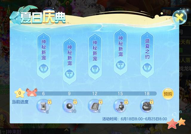 6月18日8:00至6月25日8:00,将会限时开放夏日庆典预热活动。在此期间,35级以上的玩家达到相应进度即可抢先查看新宠资讯。每累积100点活跃即可获得1点进度,每天最多可获得3点进度。不仅如此,花费300金币还可以同时解锁预购奖励领取资格和夏日庆典付费奖励领取资格,并且在达到相应进度要求后还能领取下方的诸多奖励,感兴趣的少侠们快快行动吧。