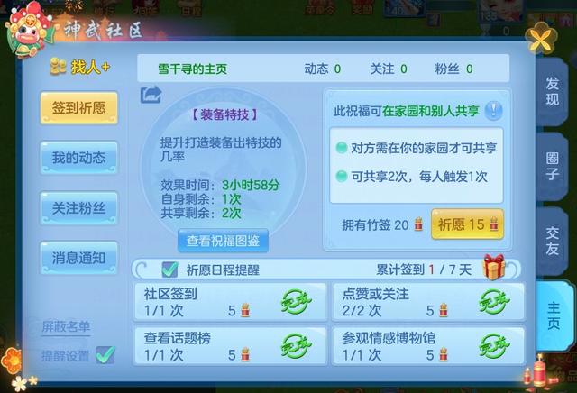 6月18日更新后,祈愿调整为不会失败,每次祈愿必定获得随机祝福,同时调整了竹签的消耗。祝福类型新增了除魔暴击、竞技积分、炼药品质、帮派强盗等多个祝福。并且,求出的祝福可与别人共享。其中,家园共享祝福需在祈愿者家园触发,队伍共享祝福需与祈愿者同队且归队才能触发。需要注意的是,自身祝福与共享祝福的次数相互独立,每人每天最多触发2种不同类的共享祝福,而同类的只能触发1次。