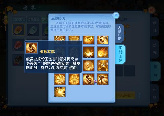 此外,血脉系统中还有能够提升自身攻击力的"天赋印记",刚才"业报本能"则属于"本能印记",这两种印记带给宠物们的提升是显而易见的,尤其是对于"神兽小龙人"、"千幻乘黄"、"九尾妖狐"等携带"业报轮回"的特殊技能宠物来说,技能的高伤害特点会得到更大的发挥空间。因此,笔者觉得,在之后的神兽选择过程中,"神兽雪精灵"不再会成为玩家的优先选择,而是会迎来诸多神兽"百花齐放"的时代。