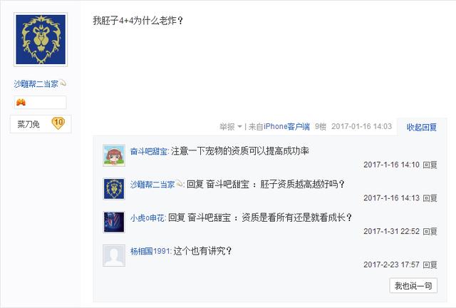 下面还有玩家提问为什4+4花生总是爆炸,大神的解答是要注意宠物的资质,小编之前也听说过宠物的等级、技能数量和质量、属性资质等等如果越接近,化生的结果就会好一些,不知道是不是真的呢?