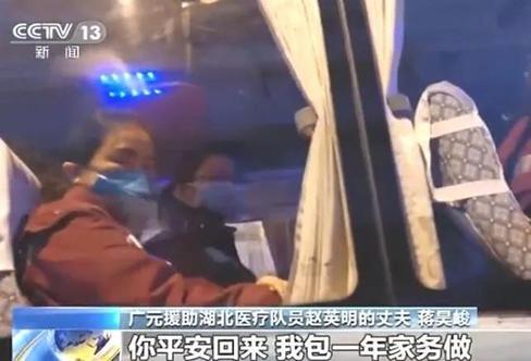 妻子赵英明所在的四川广元援鄂医疗队准备出发,在送别现场,丈夫蒋昊峻带着哭腔大喊:“赵英明,听到没有,平安回来!你平安回来,一年的家务我包做了!”