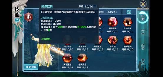 满级秘籍效果:提升醉蝶狂舞800%基础闪避值与30点移动速度,延长醉蝶狂舞持续时间5秒,同时回复4.5%最大生命。