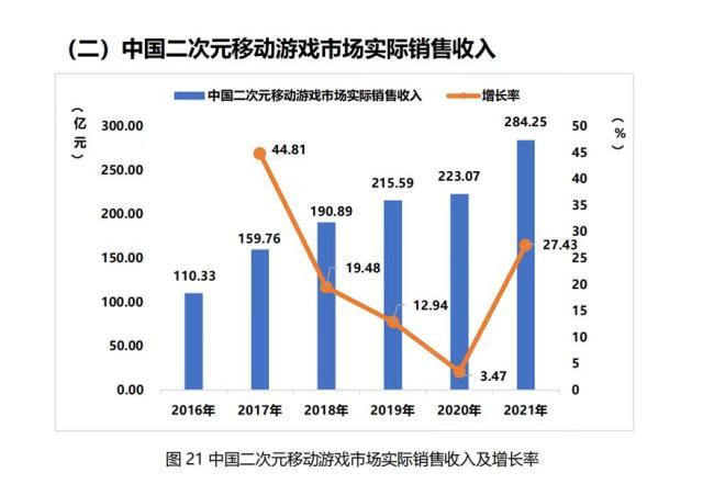《血族》上线后的这八年,也是中国游戏产业发生巨变的八年。在游戏工委统计的细分游戏市场报告中,二次元游戏的收入统计最早追溯到2016年,比《血族》手游上线还晚了2年。2016年中国二次元手游收入110.33亿元,2021年中国二次元手游收入为284.25亿元,5年时间里二次元手游收入增长了157.6%。