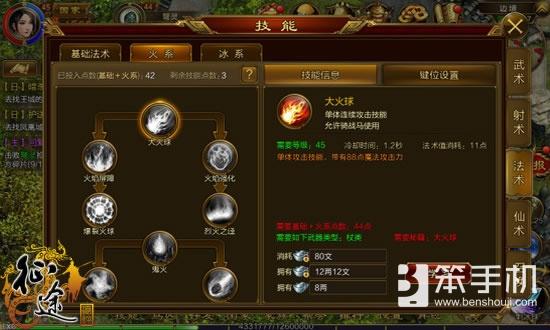 我们在技能系统中,对职业技能进行加点需十分谨慎,因为技能有前后关联性,我们需要主点的技能要学习时,就必须要有多少点前提技能点,所以你不得不把一些点加在一些旁支技能上。因为《征途手机版》中的技能学习采用的是技能树的模式,玩家想学习新的技能,必须拥有技能秘籍、有足够的技能点数、满足本系技能点数需求和等级需求三大条件。例如我本人选择火系进阶方向,那我在学习第一本火系单体攻击技能“大火球”时,需要等级45、需要基础+火系点数44和该技能秘籍。基础系技能书可以通过秘籍收藏家购买,高级系技能书可通过拍卖行或击杀BOSS获得,使用易筋宝珠可以重置技能点,也就是“洗点”,但是重置后系统赠送的这第一本也是唯一一本高级技能也一并洗掉了。因此,技能点加点的问题上一定要慎重考虑,进阶方向上也会参考基础系加点上有所倾斜的某一系技能。