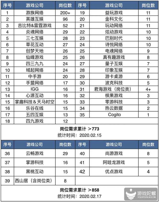 随着大众逐渐回归工作,许多公司的招聘工作逐步展开。近期,游戏陀螺进行收集和调查,截止到2月17日下午15:00共收到42家游戏公司超850个岗位需求(含2月15日微信文章发出去后收集到7家厂商需求),其中工作地在北京、上海、广州、深圳的公司分别有7家、8家、15家和9家,还有武汉5家、杭州3家,以及厦门和成都各2家,福州、长沙、苏州、天津和珠海各1家。(有公司提供多个工作地,有重复计算)