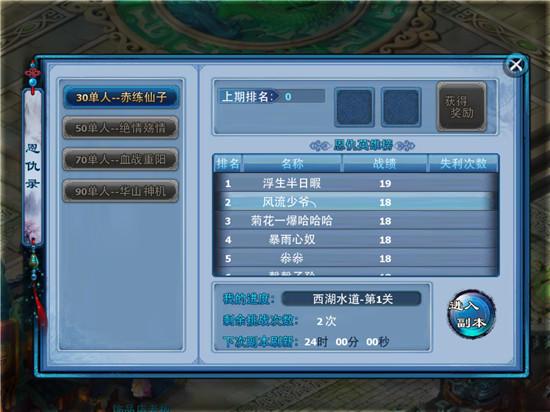 恩仇录分为30级副本“赤炼仙子”、50级副本“绝情殇情”、70级副本“血战重阳”、90级副本“华山神机”四个不同等级阶段的副本,玩家可以根据自身的条件选择相应副本进行挑战。