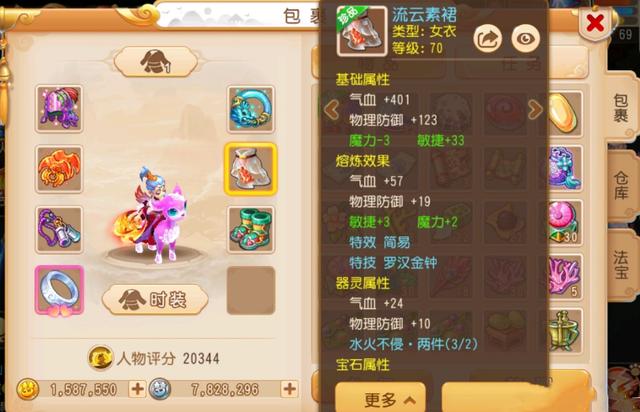 根据装备截图可以看到,这是一件"流云素裙",基础属性方面,气血+401、物理防御+133。对于衣服来说,"双加"起着重要作用,也是不少玩家关注的焦点。魔力减3,同时敏捷加33,搭配上熔炼出的3点敏捷,共计36点。对于70级衣服来说,36点敏捷是一个非常极限的属性。现如今,速度也成为了梦幻手游中的关键一环,特别是封系与辅助,速度起着重要作用。从这一角度来看,这件衣服并不简单,其实除了属性亮眼之外,"罗汉金钟"也很吸引人。