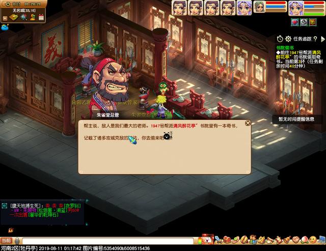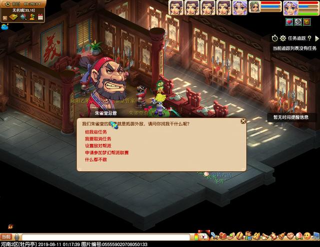 任务注意:第一次去对方帮派不要先急着做任务,要先熟悉对方帮派的建筑:青龙堂、白虎堂、朱雀堂、玄武堂、药房、兽室! 这些建筑必须熟悉,方便找任务NPC