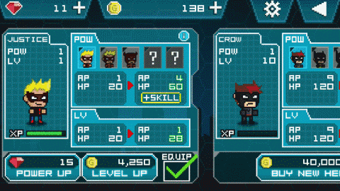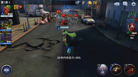 玩家将操控一队超级英雄进行闯关,击败所有来袭的敌人。游戏中采用了实时切换玩法,每支队伍中有3名英雄,可以随意进行更替。游戏提供了单手和双手两种操作模式供玩家选择。单手模式是通过点击目标进行移动或攻击,而双手模式则是传统的虚拟摇杆+按键的组。前者为休闲玩家提供了极大的方便,而后者更方便玩家进行走位。