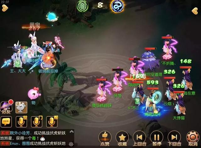 第6回合,对战方多人已处于中毒状态。观战方一速地府先手索命结算尸腐毒打输出,其他3位地府持续为对战方人物套上尸腐毒效果。虽然对战方方寸已经倒地,但对战方场上宠物已剩不多,无暇复活倒地方寸,只能让化生推气过宫维持队伍血量。不过就目前的情形来看,对战方的回复压力已变得非常之大。而观战方这边,全队血量都处于安全状态。此刻,观战方已从劣势转为优势。