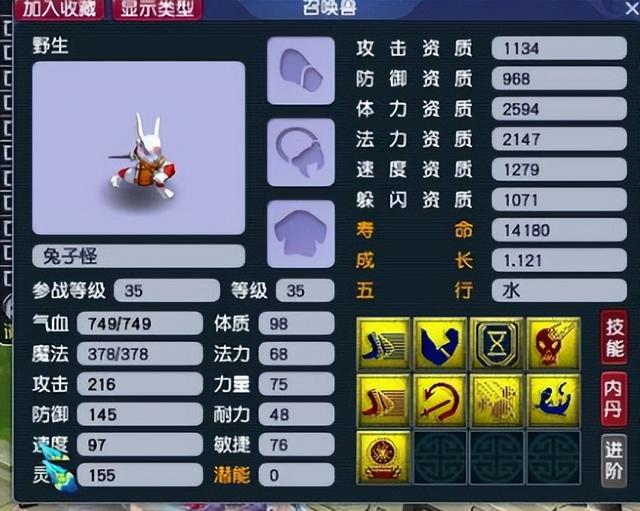 这个玩家是很喜欢兔子怪的,一直期待拥有一只不错的。这只宝宝9个技能,被他一眼就看中了。不说它的优点,其实缺点是很多的。一个就是野生,自然就缺少了很多的属性,然后就是资质不好看,成长也不行。可是好处是带了一个善恶的技能,还有高级敏捷。这两个技能是很有用的,加之9技能的兔子怪,那可是相当难出现的。