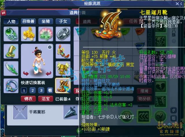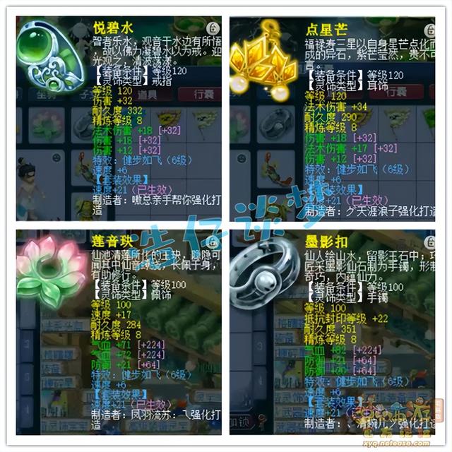 戒指和耳饰下排都是双伤害一法伤,耳饰主属性也是法伤,属性一点不浪费。佩饰下排双气血一防御,手镯下排双防御一气血,特效打了6级健步如飞。