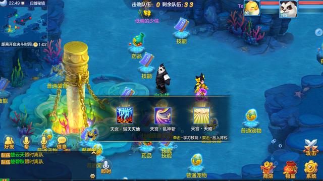 在幽冥地府,孙悟空曾擅改生死簿,导致幽冥秩序紊乱,玩家可在副本"六道轮回"中组队挑战,安定轮回道,获得地藏王的奖励。在东海龙宫,孙悟空当年所拔的定海神针附近,玩家可通过"归墟乱斗"收集装备一轮轮战胜其他对手,感受别具一格的吃鸡玩法。