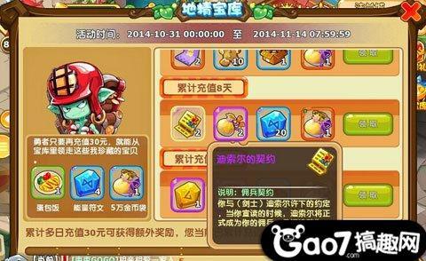《魔力宝贝》手游地精宝藏新系统使用攻略,大家快看看11月份新出的地精宝库,连续充值奖励很丰厚呀。尤其是连续充值到第八天,也就是需要充值八天不低于30元,可以奖励两个紫色的迪索尔契约。现在不知道为啥迪索尔契约是越来越难搞到,有的佣兵契约还可以通过酒店抽取。要么就是在佣兵冒险当中随机给,要么还可以通过家族副本来获取佣兵碎片,起码还有获取的途径,就是这个迪索尔很难获取。
