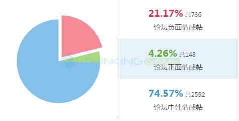 近一个月期间,统计玩家带有情感反馈的帖子数据得知,其中,仅4.26%为正面反馈,负面反馈占比超20%,其余为中性反馈。