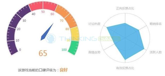 目前,该款游戏的舆情综合评分为65分,属于良好级别。从舆情状态五维图可以看出,游戏的正向反馈、畅销排名以及舆情走势数值略低。