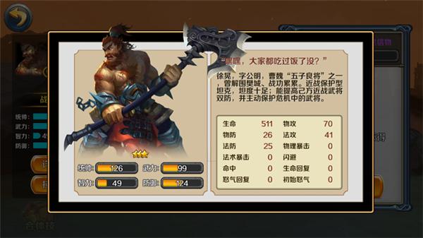徐晃,字公明,曹魏“五子良将”之一,曾解围樊城、战功累累。近战保护型坦克,坦度十足;能提高己方近战武将双防,并主动保护危机中的武将。