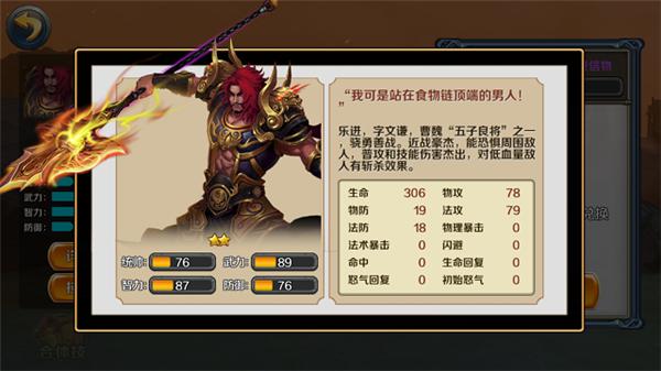 乐进,字文谦,曹魏“五子良将”之一,骁勇善战。近战豪杰,能恐惧周围敌人,普攻和技能伤害杰出,对低血量敌人有斩杀效果。