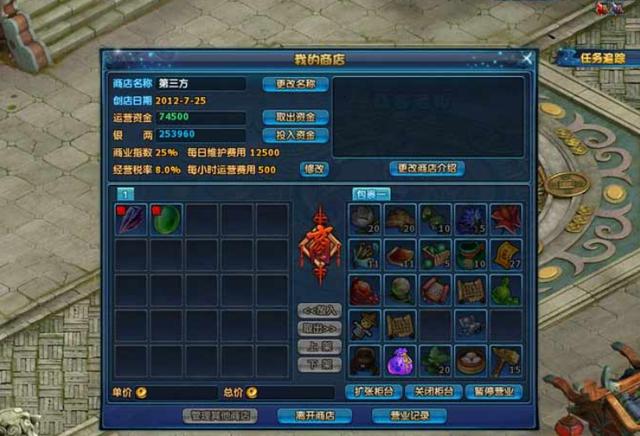 开店前提的是最先级别不低于30级,玩家可以在临安的商会老板处申请开店,每个人顶多可以享有2个商店,最多一间物品店、最多一间宠物店。点击“我想开个店”后会显示二次确认,开店所需资金由建店花费+运营花费+投资税三部分组成。玩家在开店时必须输进商店名称以及商店种类,可分为物品店和宠物店。