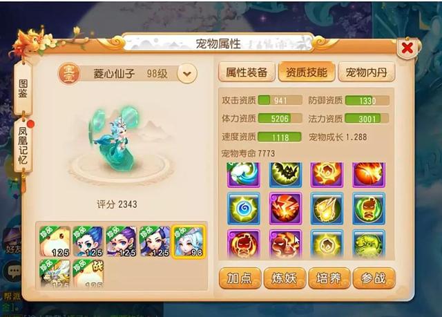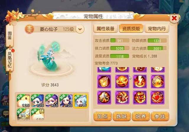首先我们来看一下今天的主角,就是这只12技能的菱心仙子,作为一只法宠,当然要看法力资质,3001的法力资质还是比较高的,而且体力资质和速度资质也非常优秀,成长是1.288,无论技能、资质还是成长,都是非常完美的,况且菱心仙子自带高级迟钝这个技能,降低自身20%的速度,并且有10%的几率减免50的物理伤害,这个技能还是相当有用的。综合来看,这是一只非常不错的法宠胚子。