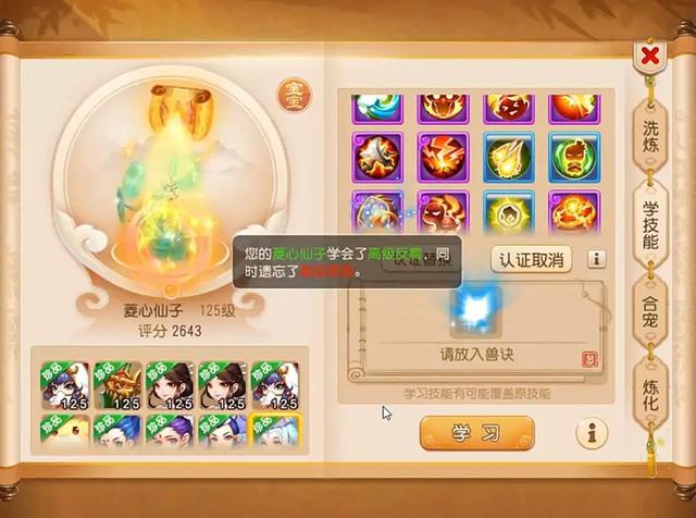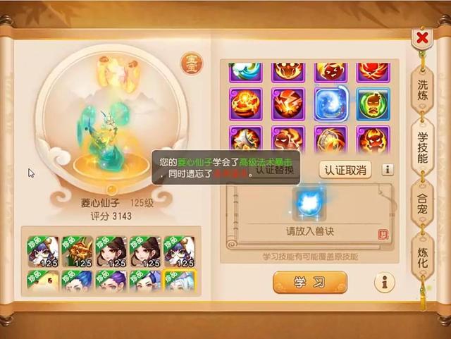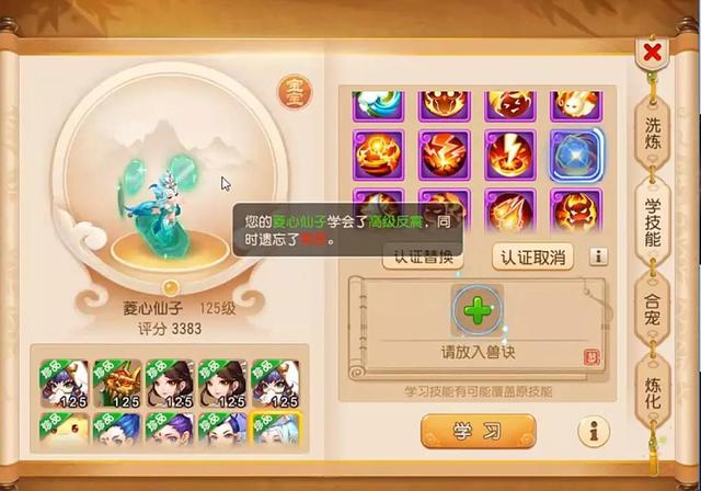接下来号主打了一本高级魔之心,顶掉了4号位的高级幸运,接着高级强壮去了12号位,顶掉了高级会心,掉什么补什么技能,继续补高级会心,顶掉了高级招架,补了一本高级招架,又把9号位的高级反震给顶掉了,继续补高级反震,顶掉了11号位置的土属性吸收,然后打了一本高级法术连击,顶掉了法术连击,虽然这波打书顶掉的技能有点多,但是高级迟钝还在,还是可以接受的。