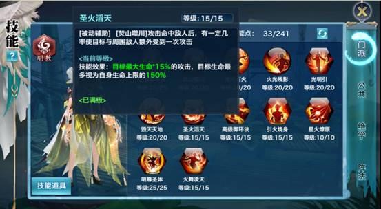 其被动技能也相当不错,除去每个门派的标配被动技能以外,有使<焚山噬川>额外造成伤害的圣火滔天;有增加自身最终忽略全抗的引火烧身;有增加基础攻击力以及基础闪避BUFF效果的火舞凌天;还有濒死时可以回血、解控免控、刷新大招毁天灭地的星火燎原技能。