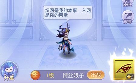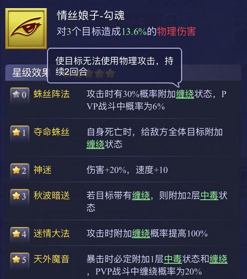 0星技能:蛛丝阵法,攻击时有30%概率附加缠绕(使目标无法使用物理攻击,持续2回合)状态,PVP战斗中概率为6%;
