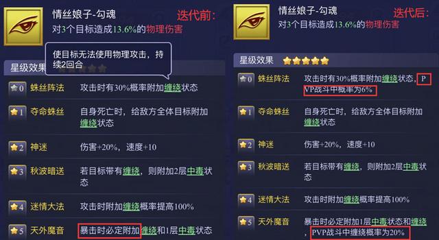 5星技能:天外魔音,暴击时必定附加1层中毒状态和缠绕,PVP战斗中缠绕概率为20%。