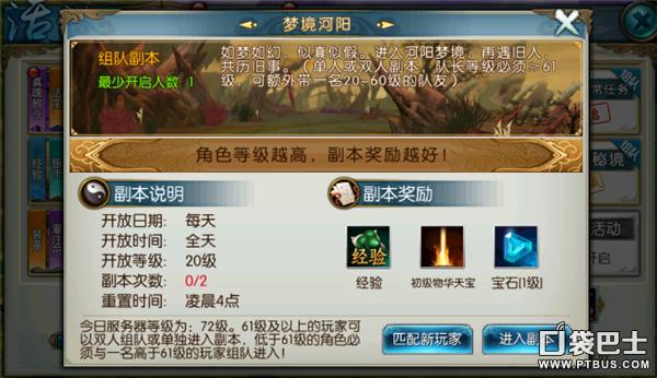 每天可做两次、活跃度10,副本奖励为经验和宝石,高级玩家则可额外获得物华天宝。目前我在的服务器61级以上的玩家便可组20-60级玩家进入副本,基本算是游戏中设计的比较温馨的副本之一。