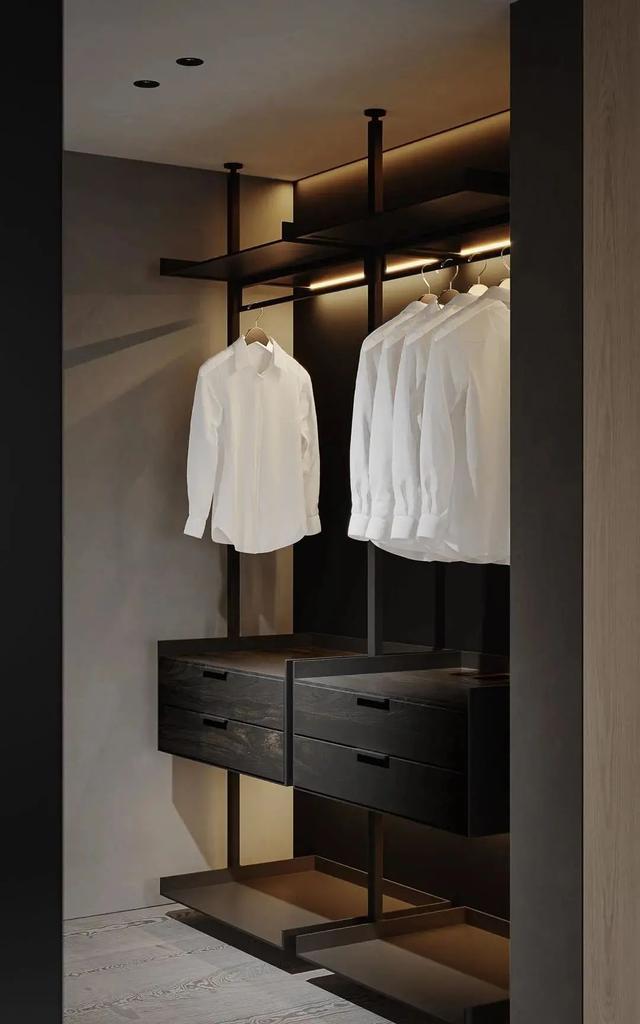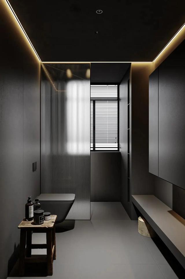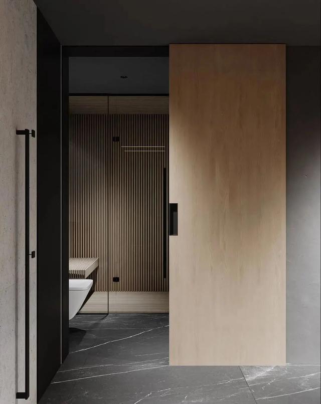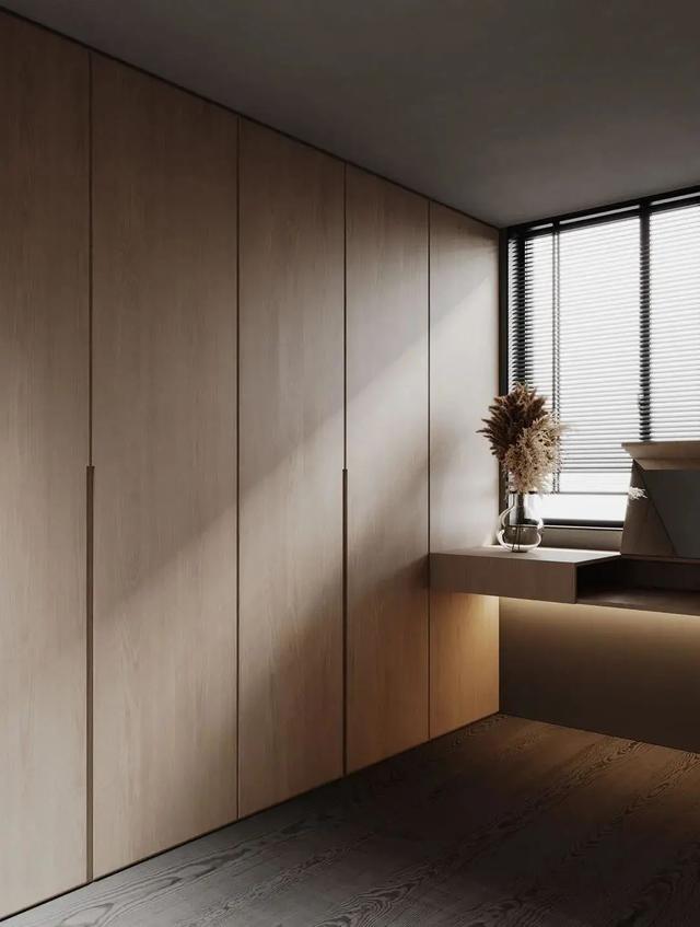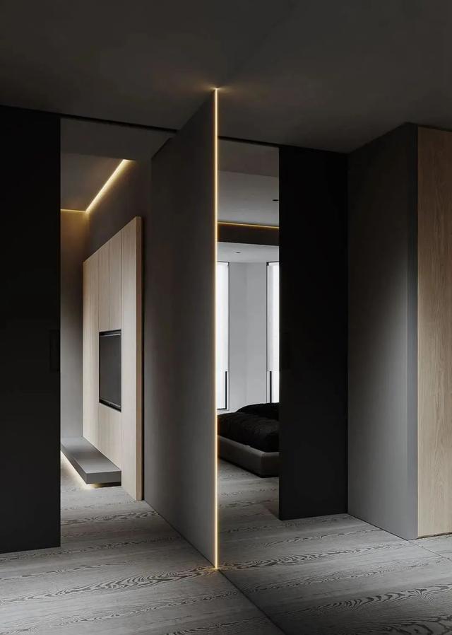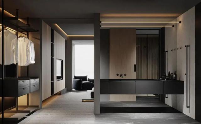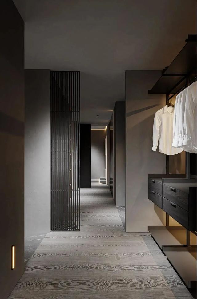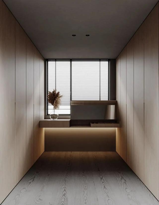 贯通的廊道中,打造了两个空间的共用区域,其中卫生间,衣帽间,房间区域有着单独的移门,可谓是心思巧妙。