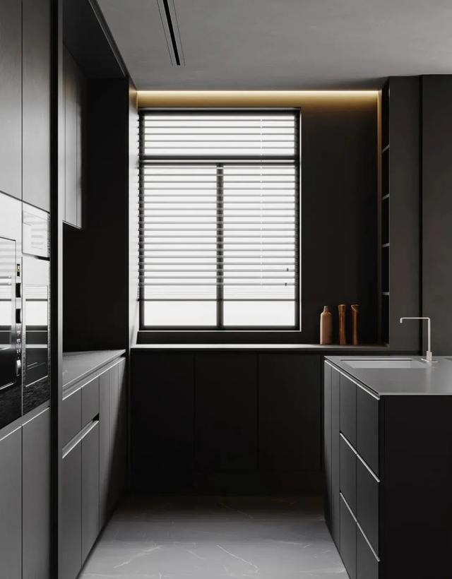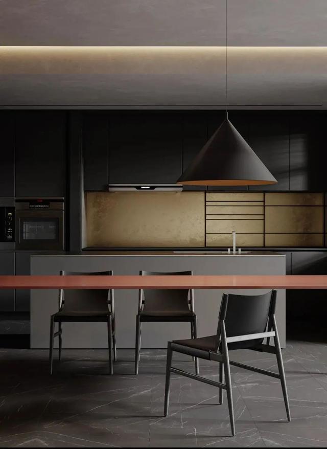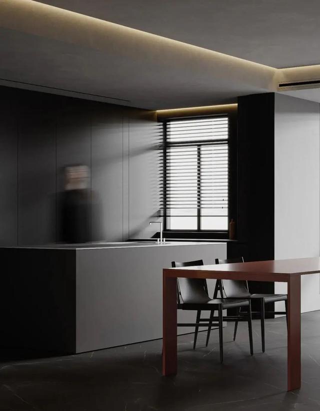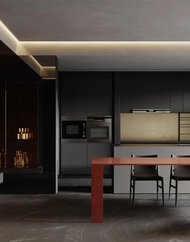 利用特殊五金将操作台面隐藏,中岛台面也安装了升降系统,Porro的配套餐桌椅呈现最极简的状态,这也是设计师空间中赋予更好生活方式的寄托。