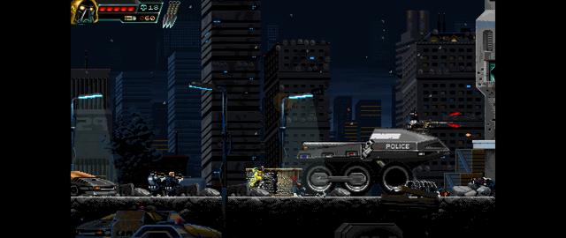 而进入关卡后,玩家就可以开杀了。可以和《合金弹头》一样捡取不同的武器,比如重机枪,UZI,散弹枪等等,种类还挺多的。