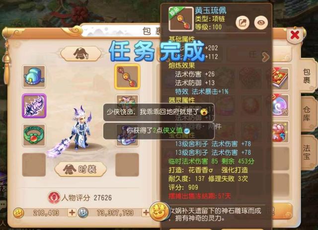 首先晒出的是角色的武器,这把武器的属性非常不错,基础法术伤害属性159点,再加上熔炼的26点,能够提供185点法术伤害属性,已经接近100级装备的属性上限。同时这把武器还有着49点魔力属性点提升,再搭配上火舞苍穹器灵两件套23点法术伤害,共可以为角色提供257点法术伤害属性面板,对人物的伤害增幅巨大!值得一提的是,这把武器还拥有法术暴击特效加持,进一步提升角色的战斗表现,配合上两颗13级宝石,可以说除了没有特技加持外,已经属于神威组法系毕业武器。