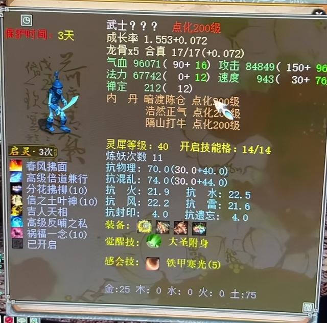 这是一只满200级的个性骷髅怪,记得一般的召唤兽满灵犀是40级。气力96071,攻击84849,非常个性,同样的除了属性再看技能:分花10级,信土10级,祸福一念10级,觉醒技能:大圣附身,感会技:铁甲寒光,比起上面的大浪差什么?