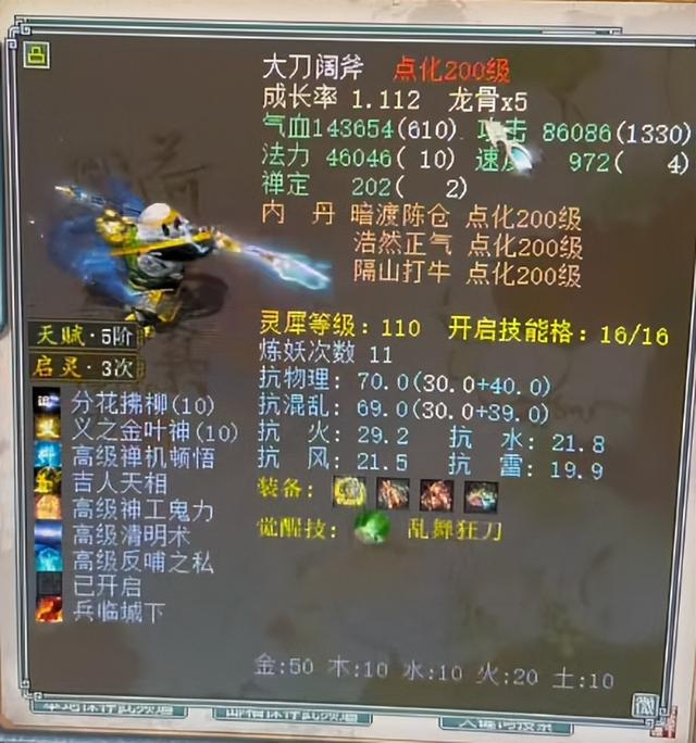 很多朋友留言要求看看满灵犀的200级大浪陶沙,110级的灵犀它来了,体力143654,攻击86086,速度972,这是一贯大浪的加点方式 ,不能太高不能太低。重点不是属性,看技能:10级分花,10级义之金叶神,这才是一个攻宠的最重要地方,兄弟们努力,愿今年人人得一只。