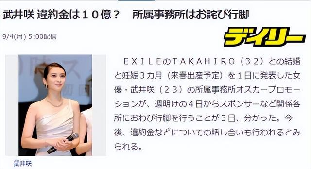 当时媒体估算违约金达到10亿日元,如果需要赔偿,将由武井咲承担全部责任。